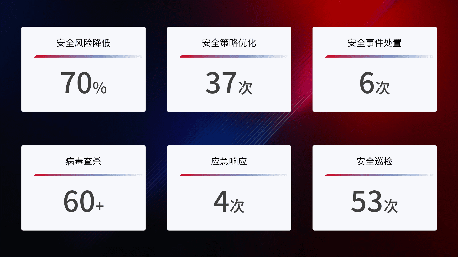 提供全面的安全事件报告体系,,,,包括处置报告、、、、周报、、季度和年度总结,,,结合持续监控,,,,帮助客户深入了解网络安全状况。。。